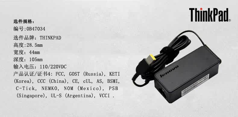 品牌名称:ThinkPad 产品参数: 证书编号:2015010907755751 证书状态:有效 申请人名称:康舒科技股份有限公司 制造商名称:康舒科技股份有限公司 产品名称:交流适配器 3C产品型号:ADE011, ADLX45NAC3A (LI P/N(内部型号): SA10E75802, FRU... 3C规格型号:ADE011, ADLX45NAC3A (LI P/N(内部型号): SA10E75802, FRU... 产品名称:ThinkPad 0B47034 生产企业: 联想 适用机型: ThinkPad 型号: 0B47034 采购地: 中国大陆 充电器适用形式: 直充 是否原装: 原装